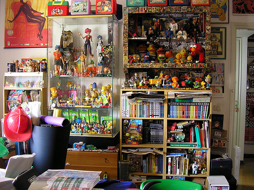 is strewn with old clothes, tapes, records, toys and other assorted