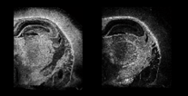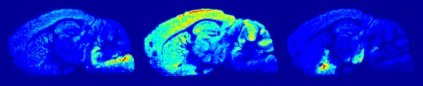 In matrix-assisted laser desorption/ionization mass spectrometry (MALDI MS), a pulsed laser ionizes molecules from a sample for mass spectral characterization. In Dr. Yeung’s laboratory, this technique is applied to map the spatial distributions of important molecules in brain tissue for neuroscience research. That is, mass spectra are collected continuously while the tissue sample is moved orderly in two dimensions. Plotting the intensities of a selected mass over the scanned areas allows us to generates MS images of the tissue shown above.
