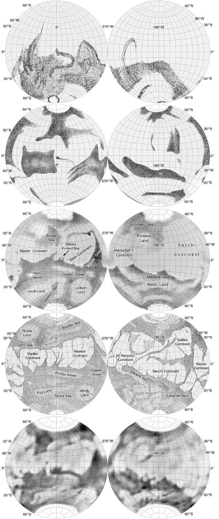 Early maps of Mars by (from top) Herschel, Beer and Madler, Green, Proctor and Mottoni