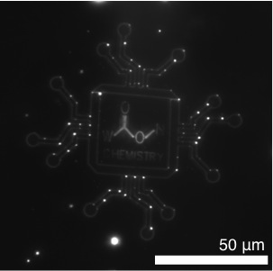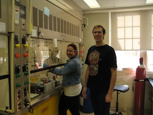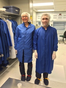 Vanessa and Matt suit up for the Nanofab clean room to do some electron beam lithography. Showing some school pride with a W[ester]N chemistry microchip pattern. Read more about it here!