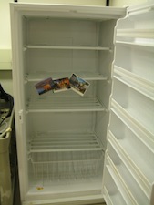 All hands on deck for the biennial chemical freezer thaw in BGS 2006. Found: six cork rings, no mammoths (fingers crossed for next time) in the ice and some old post cards on top of the freezer.