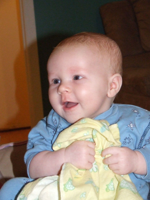 He has started grasping for items. Then he quit. He has settled into a fairly regular sleep routine – he hates sleep. Sorry, he sleeps through the night with a snack inserted at his leisure. Through the day, though, he is hit and miss; some days hold nice long naps, other short naps and some result in a cranky over tired baby. His feeding is going much better. Jenn has strategies to minimize his gaseousness and they are working well. We are back to our wonderful happy little guy again.