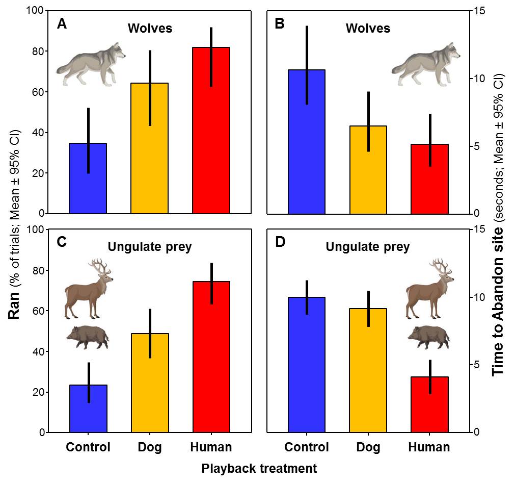 Fear of the “big bad wolf” dominates the discourse on human-wildlife conflict. Humans fear wolves, and fear wolves “losing their fear” of humans – because if they fear us, they avoid us, and that protects us. Legal protection of wolves has been alleged to permit the emergence of “fearless” wolves. We conducted an unprecedented experiment demonstrating that wolves fully retain their fear of humans, even where they are legally protected. Our results help re-focus the discourse on human-wolf conflict, from ostensibly fearless wolves, to human food subsidies better explaining why fearful wolves ever risk encounters with the human “super predator”.