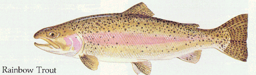 Rainbow trout are native to the waters of the Pacific Ocean drainage, members of the family Salmonidae. Their relatives include the trouts (e.g. brook trout), chars (e.g. Arctic char) and salmons (e.g. coho salmon). Rainbows, like other salmonids, are carnivores, feeding on smaller fish and insects. Rainbow trout are found virtually all over North America, having been stocked for many years in, amongst other places, the Great Lakes basin. Prized for their tasty flesh and their "fight" the rainbow trout are a popular target for recreational fishers. It is their abiblity to sprint (manifested as "fight" at the end of a fishing line) that makes the rainbow trout an appealing model system in which to study the exercise physiology of muscle. A moderate size (~ 500g) rainbow trout can accelerate from a standstill to about 35 km/h in about one second; attaining a speed of about 10 km/sec (almost instantaneously! Rainbows are also known for their jumping ability, having to routinely navigate waterfalls on their upstream spawning migration. They can easily leap into the air a distance 3-4 times its body length. For a human, this would be akin to jumping out of a swimming pool 5-7 meters into the air!!