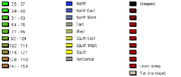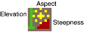 Elevation is represented by the 'flagpole' symbol. Higher values are brown while lower elevations are green. The Orientation variable is represented by a 'sun' symbol. Southerly facing slopes are yellow. North facing slopes are blue. The Steepness variable is represented by the 'stepped slope' symbol. Steeper values are bright red (see legend below).